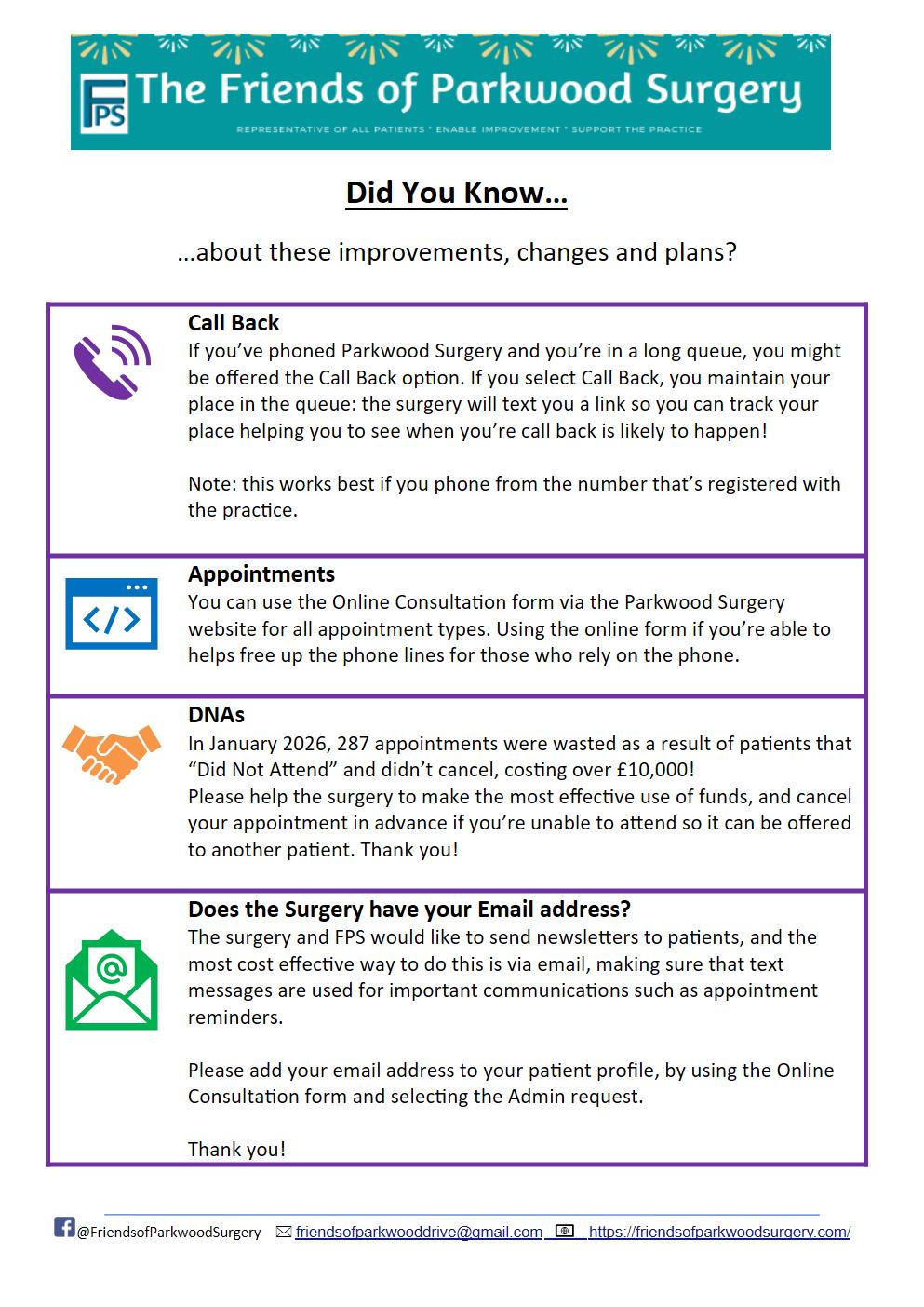 From 01 March 2023, Parkwood Surgery email requests for repeat prescriptions have no longer been accepted whether submitted by you, or your nominated pharmacy.