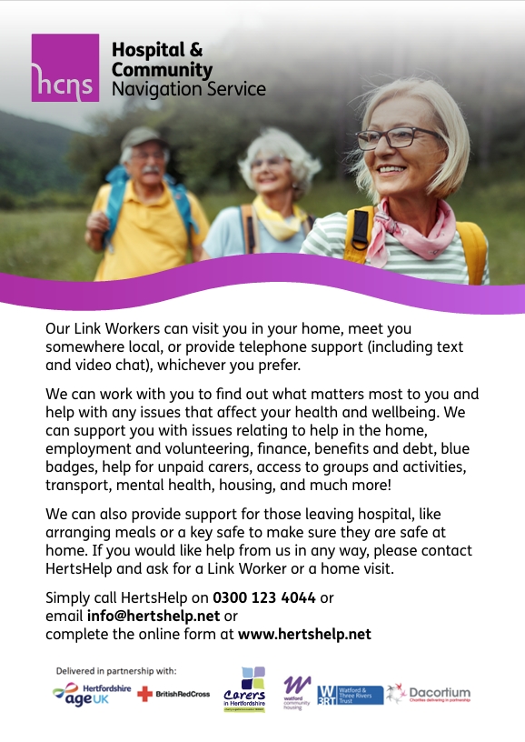 Lynda and Erika’s services are provided to Parkwood Surgery from HertsHelp, a network of community organisations in Hertfordshire which work together to help residents find support for a whole range of issues. If you think you or someone you know could benefit from some help, but you’re not sure quite what, you can make a self-referral to HertsHelp by calling 0300 1234044 or emailing info@hertshelp.net.
